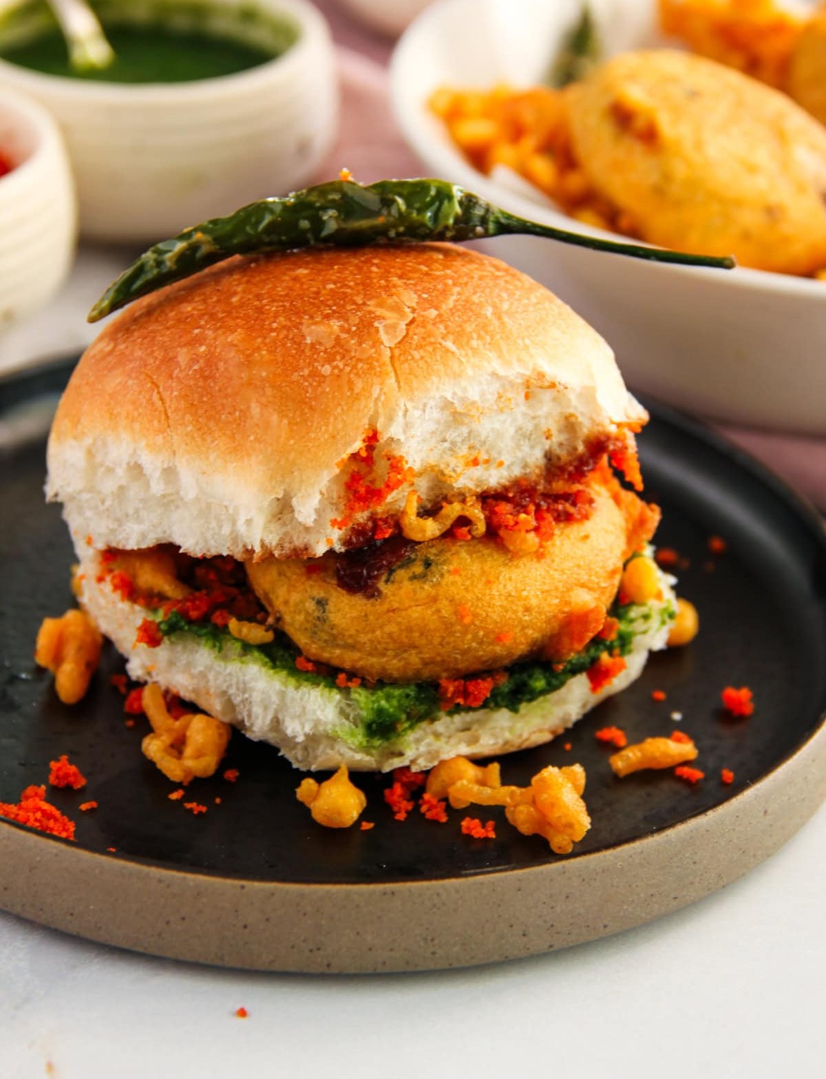 It's a spicy potato fritter (vada) placed in a soft bun (pav), served with chutneys and fried green chili.